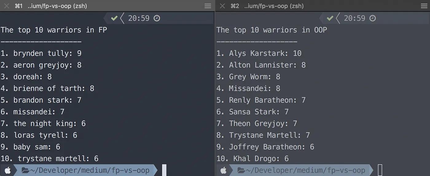 Both produce the same output and run the same scenario, but the OOP version ends up with about the double of lines of code comparing to the FP version. Normally the OOP approaches are more verbose than the FP versions, this example is no exception.